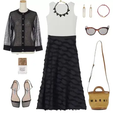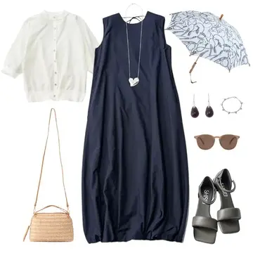 しっかり二の腕をカバーしてくれるので、こんなキャミソールドレスとのレイヤードもおすすめ。