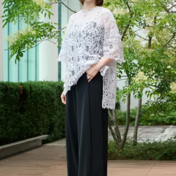 腰まわりにゆとりがあるワイドシルエットでありながら、落ち感のある素材と直線的なラインで高身長さんが穿いても迫力が出すぎないのが強み。「フラット靴を合わせて丈がジャスト。普段E by éclatのボトムは40サイズを選ぶことが多いのですが、38がぴったりで嬉しい(笑)! バックゴムだから“お腹苦しくないかな“という不安がないのもいいですね。気楽に履けるのにきれいめな雰囲気に見えるので、カジュアル服から華やかなトップスまで幅広く楽しめそうです」(水口さん)