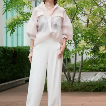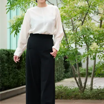162cmの松ヶ崎さんも、36レギュラー丈がしっくり。シンプルなブラウスとのワンツーコーデもタックが映える美シルエットだから無難にならず印象的に。「ヒール靴を合わせても短すぎないし、スニーカーともバランスが良さそう。ウエスト部分はバックゴムで、きちんとしたい日もラクに履けて助かります」(松ヶ崎さん)