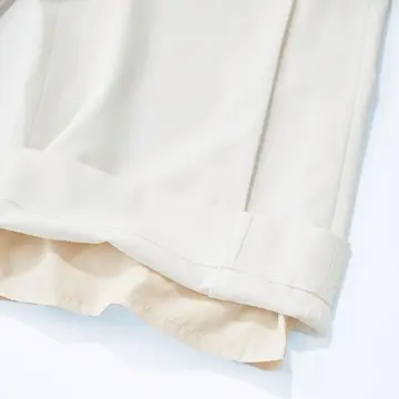 裾の折り返し部分を通常よりも幅広にとることで、万一レングスが足りない場合でも裾出しして着られるように設定。また、色違いのホワイトは総裏地つきなので、透けが気にならず安心してはける。