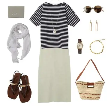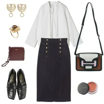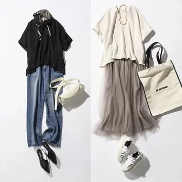 シルバーウィークの旅行には、快適さときちんと感を両立したコーディネートが理想。なめらかなコットン素材のTシャツは、後ろ下がりのシルエットとタック入りのデザインで、シンプルながらもほんのりモードな雰囲気に。透けにくく、裾アウトでもバランスよく決まるので、移動中もストレスフリー。合わせたリブスカートは、後ろのボタンでスリットの長さを調整できる優れもの。フロントは極限までシンプルだから、トップスのデザインが引き立ちます。荷物が増えても安心なレスポートサックのボストンバッグを添えて、旅先でもおしゃれに過ごせる大人のカジュアルスタイルが完成。