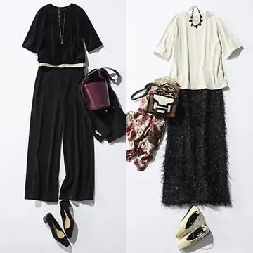 ほんのり光沢のあるベロアTシャツと、ハリのある裏毛スウェットパンツの組み合わせは、リラックス感がありながらも品よく決まる大人のカジュアルスタイル。ホワイトのベロアTシャツは透けにくく、五分袖で二の腕もすっきり見え、一枚で着映えする優秀アイテム。チャコールカラーのスウェットパンツは、デニムライクなディテールでラフすぎず、オンタイムにも対応可能。黒のレースジャケットを羽織れば、モノトーンでまとめた洗練スタイルに。赤のバッグや柄スカーフでアクセントを加えれば、秋の街に映える大人の休日コーデが完成します。