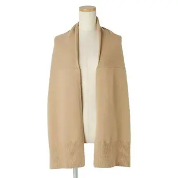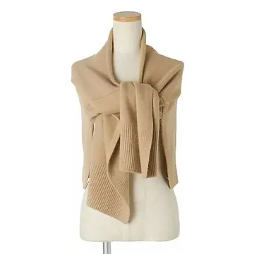 ニットの袖のような両端部分と凸型になったセンター部分からなるストール。一枚のニット仕立てでかさばらず、かけても巻いてもすっきり。まだまだ暑い時期でも、Tシャツの上にプラスするだけで秋らしい装いに。マフラーのように首まわりにぐるぐると巻いてもスタイリッシュに決まる。