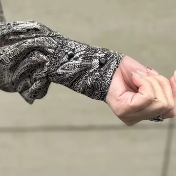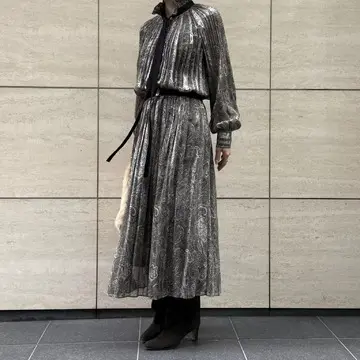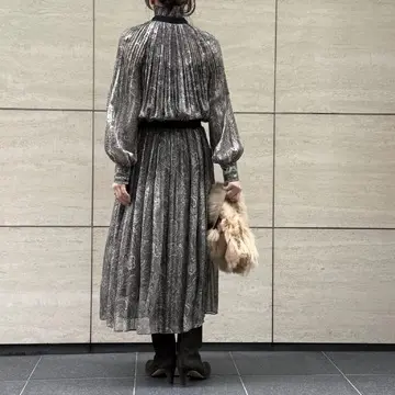 年末年始のお呼ばれやホテルランチ、ディナーにぴったりの一枚。サテンと楊柳のストライプ地にペイズリー柄を施した生地は、ほんのり透け感と上品な光沢を備え、動くたびに優雅な表情を見せます。プリーツのピッチを上半身とスカートで変えることで、肩まわりはふんわり、腰まわりはすっきり。黒のボウタイとベルトが全体を引き締め、甘さを抑えた大人の華やぎを演出します。ウエストはゴム仕様でラクなのに、美しいシルエットをキープ。内側のアジャスターでサイズ調整もでき、身長155cmの私でも丈感はぴったり。ゴムベルトだから、食事を楽しんでも安心。着るだけで気分が上がる、頼れるドレスです!