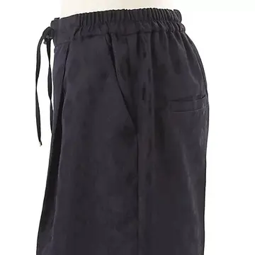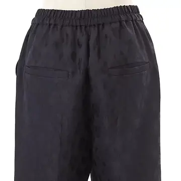 異なる織り地を組み合わせて柄を描いたジャカード素材はほどよい光沢感が特徴。張り感があるのではくと立体的なシルエットになり、シャープなセンタープレスのおかげで脚がすっきり長く見えるのもうれしい。ウエストのコードを締めることでフィット感が調整できるので便利。コード先端にあしらったゴールド金具がエレガントな印象。