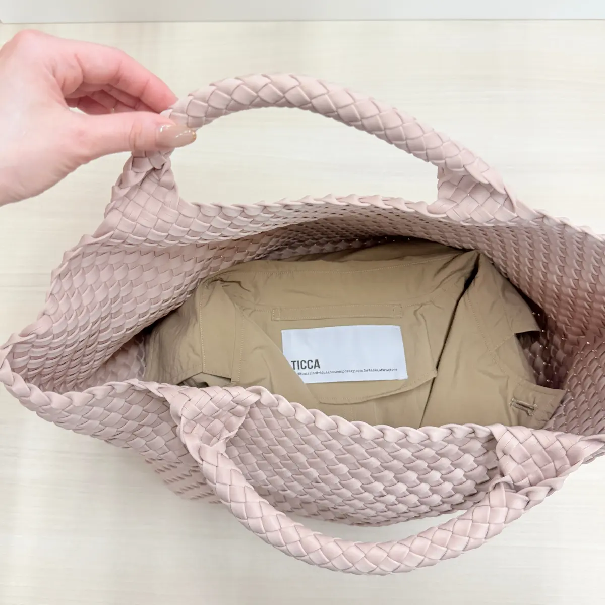 ストームシールド(アンブレラヨーク)を背面に配置。GRS認証取得のリサイクルナイロンを使用し、なんと270gという驚きの軽さに!素材にもよりますが、一般的なトレンチコートの重さは約1~1.5㎏なので、5分の1ほどの軽さになります。小さくたたむこともできるので、大きめのバッグなら収納も可能です。