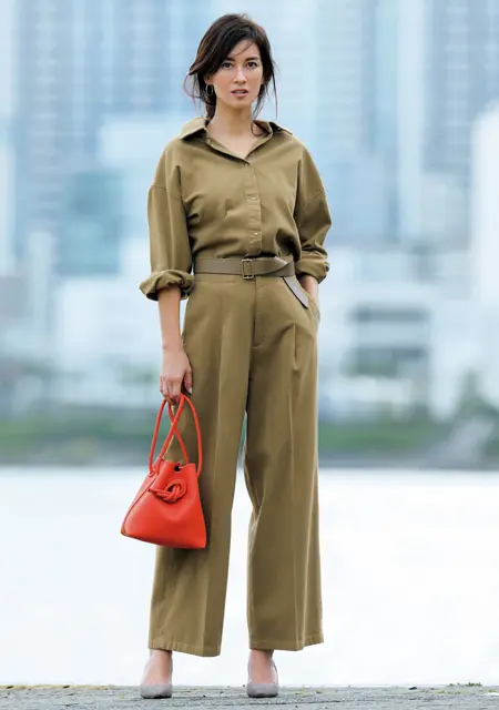 パンツ派の私にとっても、うれしいトレンドです。今シーズン、私たちエクラ世代が目ざしたいのは、カジュアルすぎない、どこかモードな空気感が漂うパンツスタイル。今どきのシルエットやカラーを意識したアイテム選びをしました」(村山さん)