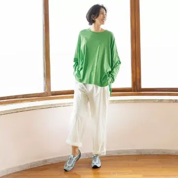 タックや切り替えにより緻密に計算された立体感が上半身の肉感を拾わない優秀カットソー。二の腕をふんわりカバーしつつ手首は華奢に。誰もが細見えする構築的フォルム。