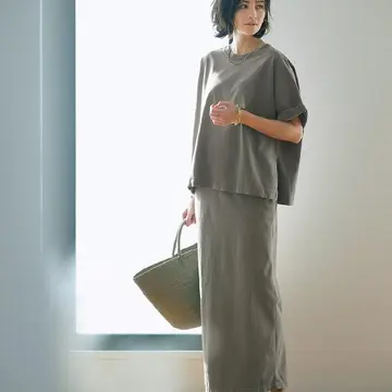 両サイドの切り替えデザインがすっきり見えの秘密。深めに入れたバックサイドのスリットで、女らしさと動きやすさをキープできる。グレージュとブルーグレーの2色展開。