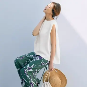 「今シーズン多く見かけるプリントボトム。ニュアンスカラーのゼブラ柄を引き立てつつうまくなじませるならクリーンな白を。なかでもこんな薄手でフェミニンなプルオーバーなら、きれいめに今どき感とおしゃれ感をプラスできます。風が通って涼しく、さらにさりげなく体型カバーしてくれるのも大人にはうれしいポイント。」(スタイリスト 村山佳世子さん)