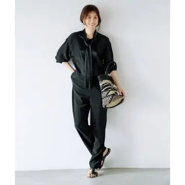 「夏、私が最も頼りにするのは、ラクで涼しいカットソー素材のワンピース。一枚でおしゃれに見えれば、あとは小物をプラスするだけで、シーンを問わず着倒せます。ワンマイルに見えず、シックな大人の装いに見える一着を、まずは別注しました。そして小物は"このプライスでこの存在感なら満足!"な3アイテム。チープにならない大人のクオリティにこだわって厳選したのは、暑苦しくなく、顔がシャープに見えるピアス、横長フォルムでバランスよく持てるかごバッグ、ボリュームがありながら軽いトングサンダルです。シンプルだけど、涼しげで小粋、しかも好バランス! これ、小柄はもちろん、多くのかたにぴったりの夏スタイルだと思います(笑)」(宮崎さん)。