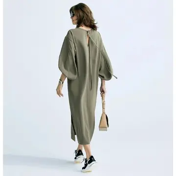 細くたらした胸もとのリボンを結んだり、付属の共布ベルトを締めれば、異なる表情を楽しめる。