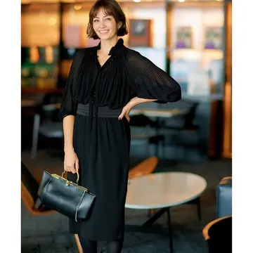 胸もとを変化させるタイが上品な印象。ウエスト内側はドロスト仕様に。外からは見えずに調整可能。
